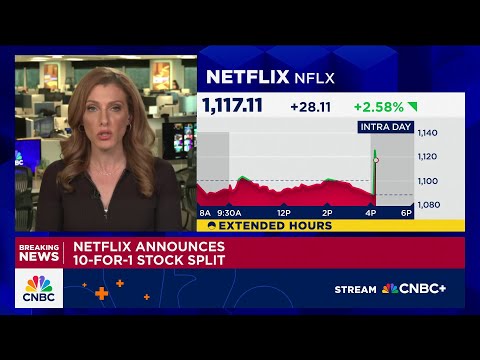 Netflix (NFLX) on Thursday announced it will split its stock 10-for-1, meaning Netflix shareholders will receive 10 shares for every one share of the company they currently own. Netflix stock, as a result, will trade at one-tenth of its current price. Shares closed at $1,089 apiece on Thursday. In a statement, the company said the move was being made to "reset the market price of the Company's common stock to a range that will be more accessible to employees who participate in the Company's stock option ...