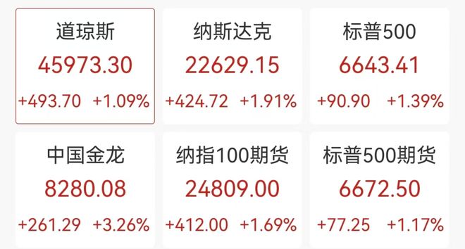 记者丨余纪昕 编辑丨曾芳 刘雪莹 | 道琼斯 | 纳斯达克 | 标普500 | | --- | --- | --- | | 45973.30 | 22629.15 | 6643.41 | | +493.70 +1.09% +424.72 +1.91% +90.90 +1.39% | | | | 中国金龙 | 纳指100期货 | 标普500期货 | | 8280.08 | 24809.00 | 6672.50 | | +261.29 +3.26% +412.00 +1.69% +77.25 +1.17% | | | 今晚美股大涨,中国资产大爆发,黄金白银再创新高! 北京时间10月13日,美股三大股指高开后涨势扩大。截至22:38,纳斯达克综合指数涨近2%,道琼斯指 数、标普500指数均涨超1%。 美股半导体、黄金、核电等板块涨幅明显,英伟达涨2.7%,博通涨超10%,台积电涨7.6%,甲骨文涨超 5%。 纳斯达克中国金龙指数涨超3%,蔚来涨超7%,阿里巴巴涨近6%,百度涨近5%,富途控股涨6.7%。 | 代码 | 名称 | 现价 | 涨跌 | 涨跌幅 | | --- | --- | --- | --- | -- ...