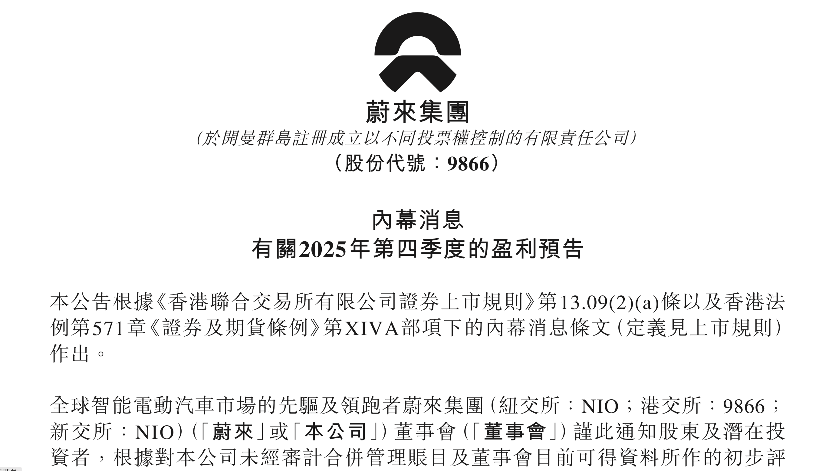 公告显示,主要受以下因素综合影响,2025年第四季度销量持续增长,有利的产品组合推动汽车毛利率优化,持续推行全面降本增效措施。 首度实现盈利! 其中,2025年第四季度销量持续增长有力推动蔚来盈利。数据显示,2025年四季度,蔚来累计交付124807辆,达成12万至12.5万辆的交付指引,三品牌协同 效应逐步显现。蔚来全新ES8大幅热销形成有力驱动,1月18日,蔚来宣布全新ES8开启交付后的第120天,交付量突破5万辆。 近日,根据蔚来在港交所发布公告显示,公司预计2025年第四季度首次实现单季度经调整经营利润(非公认会计准则),盈利区间为人民币7亿元至12亿 元,同比去年实现大幅扭亏为盈。同时,按公认会计准则计量,蔚来预计2025年第四季度经营利润为人民币2亿至7亿元(约0.29亿美元至1亿美元),同样 实现盈利。 蔚来汽车董事长李斌表示,2026年的经营目标是整年盈利,结合供应链持续降本,销售、研发、管理费用控制持续优化,2026年综合毛利率有望达到20%。 南方+记者 拱千舒 ...