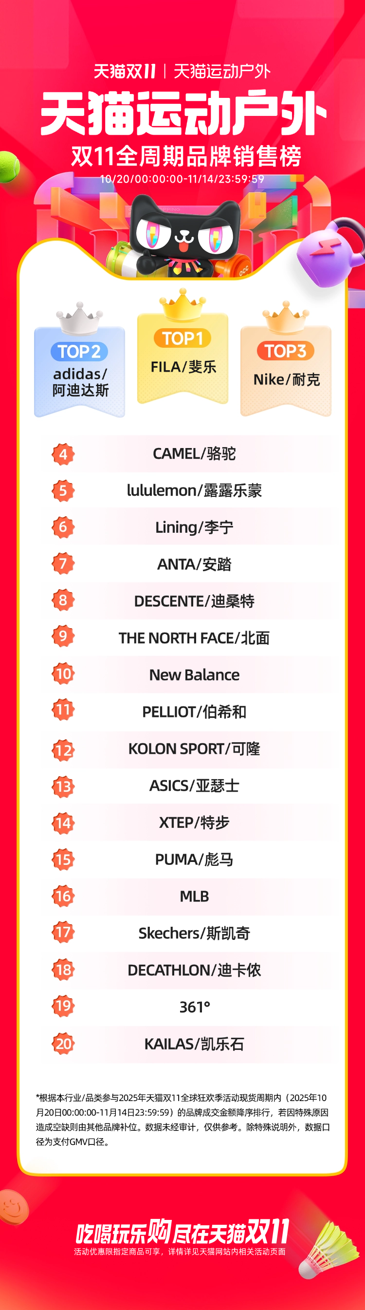 Core Insights - The sports market is undergoing significant reshuffling, with FILA ranking first in the Tmall Double Eleven sales, followed by Adidas and Nike, marking Nike's first drop from the top position in years [1] - The competitive landscape is intensifying, with domestic brands like FILA, Li Ning, and Anta gaining ground against established international brands [8] Group 1: Market Performance - FILA has shown strong performance in the sales rankings, with multiple products entering the top sales categories during the Double Eleven event [1] - Nike's revenue in the Greater China region has been declining, with a reported drop of 10% to $1.512 billion (approximately 10.775 billion RMB) for the latest fiscal quarter [7] - Despite the decline, Nike remains the largest sports brand in China, although its market share has decreased from 18.1% to 16.2% [7] Group 2: Strategic Adjustments - FILA has implemented a "ONE FILA" strategy under new CEO Jiang Yan, focusing on resource consolidation and increased investment in tennis and golf [3] - Nike is also recognizing the importance of localized operations, appointing local executives and establishing a creative center in Shanghai to enhance its market presence [4] - The competitive pressure is forcing both international and domestic brands to adapt their strategies to maintain market relevance [8] Group 3: Consumer Behavior and Market Trends - The decline in Nike's sales is attributed to a shift in consumer shopping behavior, with longer purchasing cycles and increased discounting in the local market [7] - Domestic brands are increasingly closing the product gap with international competitors, emphasizing the need for effective marketing strategies [8] - The overall market environment is challenging, with some domestic brands like Peak reporting significant losses in their direct sales segments [8]