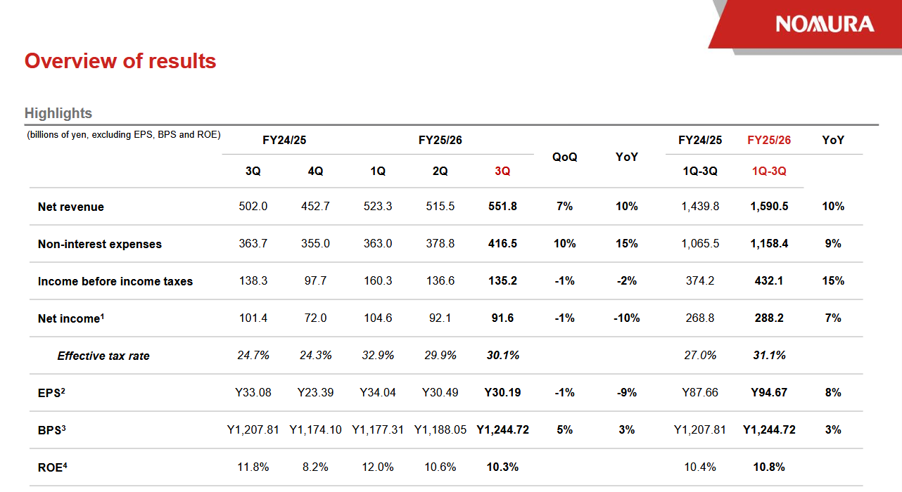 智通财经APP获悉,日本最大券商野村控股(NMR.US)周五公布的财报显示,在截至2025年12月31日的第三财季,该公司净营收为5518亿日元,同比增长 10%;税前利润为1352亿日元,同比下降2%;净利润为916亿日元,同比下降10%;每股收益为30.19日元,上年同期为33.08日元。Q3非利息支出同比增长15%至 4165亿日元;有效税率为30.1%,高于上年同期的24.7%和上一季度的29.9%。 | (billions of yen, excluding EPS, BPS and ROE) | FY24/25 | | | FY25/26 | | QoQ | YoY | FY24/25 | FY25 | | --- | --- | --- | --- | --- | --- | --- | --- | --- | --- | | | 3Q | 4Q | 1Q | 2Q | 3Q | | | 1Q-3Q | 1Q- | | Net revenue | 502.0 | 452.7 | 523.3 | 515.5 | 551.8 | 7% | 10% | 1,439.8 | 1,59 | | Non-i ...