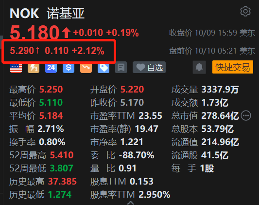 诺基亚(NOK.US)美股盘前涨超2%报5.29美元。消息上,诺基亚宣布,它已与HPE达成协议,授权技术 资产,这将提高其在人工智能无线接入网络(RAN)自动化方面的能力。此举将进一步加强诺基亚行 业领先的MantaRay SMO(服务管理和编排)平台,并扩展其在人工智能驱动的RAN自动化和自主网络 方面的解决方案。(格隆汇) | NOK 诺基亚 | | | | --- | --- | --- | | 5.1801+0.010 +0.19% | | 收盘价 10/09 15:59 美东 | | 5.290 ↑ 0.110 +2.12% | | 盘前价 10/10 05:21 美东 | | 三 7 24 S m 9 目 ♥ 白 一 白 | | ● 快捷交易 | | 最高价 5.250 | 开盘价 5.220 | 成交量 3337.9万 | | 最低价 5.110 | 昨收价 5.170 | 成交额 1.73亿 | | 平均价 5.184 | 市福率 TM 23.55 | 总市值 278.64亿 (…) | | 振 幅 2.71% | 市盈率(静) 19.47 | 总股本 53.79亿 | | 换手率 0.80% ...