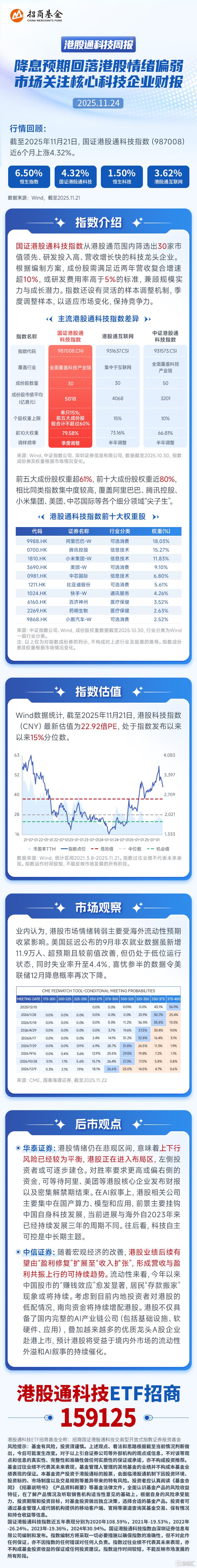 Core Viewpoint - Chinese concept stocks experienced a collective surge, with the Nasdaq China Golden Dragon Index rising by 2.82% on November 24, 2023, driven by expectations of a potential interest rate cut by the Federal Reserve in December [1] Group 1: Market Performance - Major Chinese stocks saw significant gains: Baidu increased by over 7%, Bilibili by over 6%, Alibaba by over 5%, NetEase by over 4%, and NIO by over 3% [1] - The probability of a 25 basis point rate cut by the Federal Reserve in December rose to 82.9%, a substantial increase from previous forecasts [1] Group 2: Industry Outlook - CITIC Securities indicated that with macroeconomic improvements, Hong Kong stocks are expected to transition from "earnings recovery" to "revenue expansion," creating a sustainable upward trend in both revenue and profit [1] - The Hong Kong stock market is poised to benefit from the outflow of liquidity from domestic and international markets, alongside the ongoing AI narrative, as more high-quality leading A-share companies list in Hong Kong [1] Group 3: Index and ETF Information - The National Index Hong Kong Stock Connect Technology Index selects 30 leading technology companies based on market capitalization, R&D investment, and revenue growth, including Tencent, Alibaba, Xiaomi, Meituan, SMIC, and BYD [5][8] - The index requires constituent stocks to have a compound revenue growth rate exceeding 10% over the past two years or an R&D expense ratio above 5%, balancing scale and growth potential [5] - The latest valuation of the Hong Kong Technology Index is 22.92 times PE, positioned at the 15th percentile since its inception [12] Group 4: Key Constituents - The top five constituents of the Hong Kong Stock Connect Technology Index include Alibaba (18.03%), Tencent (15.27%), Xiaomi (11.83%), Meituan (9.10%), and SMIC (6.80%) [9] - The index has a high concentration, with the top five stocks accounting for over 61% and the top ten nearly 80% of the total weight [7] Group 5: Future Market Sentiment - Huatai Securities noted that the sentiment in the Hong Kong stock market remains pessimistic, indicating a balanced risk profile, suggesting that investors may gradually build positions [20] - CITIC Securities anticipates that the "money-making effect" in the Chinese stock market will continue, with domestic investors likely to increase their allocation to Hong Kong stocks due to current underexposure [20]
