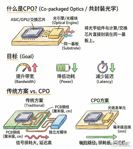 本文来自格隆汇专栏:半导体行业观察 作者:L晨光 如今,当算力堆叠的竞赛迈过万卡级门槛,AI基础设施的角力场正从芯片本身的制程工艺,悄然转向芯片之间的连接效率。大模型参数以指数级膨胀, 传统可插拔光模块在带宽密度与功耗墙面前步步维艰,铜缆则在224Gbps的速率下将传输距离压缩至两米以内,一场围绕"管道"的极限突围战已然打响。 在此背景下,共封装光学(CPO)不再仅是实验室的前沿命题,而是迅速跃升为产业聚焦的核心议题。 重新定义芯片间的"高速通道" CPO全称为Co-Packaged Optics,即共封装光学或光电合封,是一种创新的光互连架构,将高速光引擎/光模块与交换芯片(Switch ASIC)或大规模AI计算 芯片通过2.5D/3D先进封装技术集成在在同一封装基板或同一机箱内,其核心逻辑是实现"电短光长"的高效互连——将高速电信号传输限制在毫米级的近 距离范围内,中远距离传输则交由光纤完成,旨在从根源上解决传统可插拔光模块存在的功耗高、信号损耗大、带宽受限等痛点。 图源:飞奔的丸子 依托硅光子这一底层核心技术,CPO可有效集成调制器、探测器等关键器件,在性能上展现出碾压式优势。相较于传统方案,其功耗可 ...