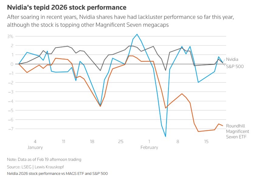 智通财经APP获悉,随着有"地球最重要股票"称号的"AI芯片霸主"英伟达(NVDA.US)将在美东时间周三美股收盘后(北 京时间周四晨间)公布季度业绩,一场关于AI算力投资主题的"压力测试"也随之到来。聚焦于AI算力基础设施以及更广 泛AI基建狂潮的全球投资者们正寻求证据,证明这家全球最高市值芯片巨头的利润正在紧密依托高达6500亿美元至 7000亿美元的美国四大科技巨头(hyperscalers)巨额AI资本支出预算大趋势而同步实现强劲增长预期。 与此同时,来自hyperscalers近期密集宣布将推出基于自研模式的性价比更高AI ASIC芯片的动向,也正显现出对英伟达 在全球AI基建最核心领域——AI芯片领域长期绝对主导地位构成风险的迹象。 在过去三年推动美国股市迈向超级牛市轨迹之后,在纳斯达克100指数以及标普500指数中占据高权重的英伟达股价在 2026年迄今仅上涨约2%,主要因Anthropic一系列AI代理产品引发的"AI末日叙事"重创软件股以及高估值的科技巨头 们,加之超大规模云厂商们加速自研性价比更高的替代AI ASIC芯片(比如TPU)并推动多供应商策略,叠加AMD等竞争 加剧。下图为英伟达 ...