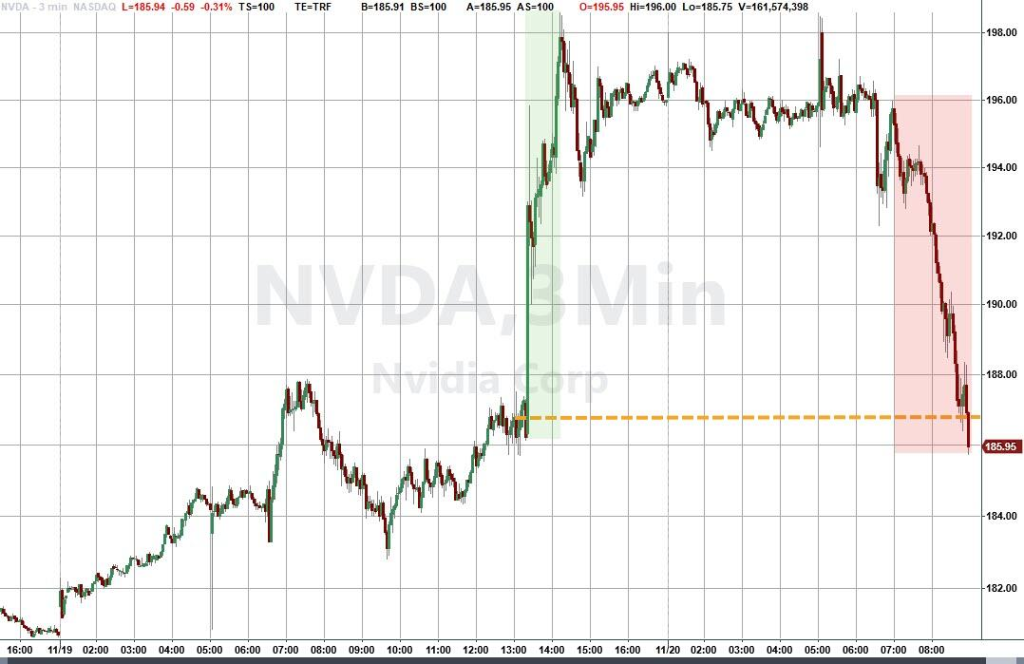 Fox Business Alert. The thousandpoint market swing where the early rally was completely torched has investors heads spinning, but Nvidia's Jensen Wong is looking skyward after his company's third quarter earnings smashed expectations. Now, look, let's be clear.Nvidia has not escaped being bitten by the jaws of today's volatility. At its highs, it was at 196. It's at 181 right now.Lost 5% of gains and is now down 2.6%. But the AI chip king's revenue surge shows its business is charging forward. It is the pre ...