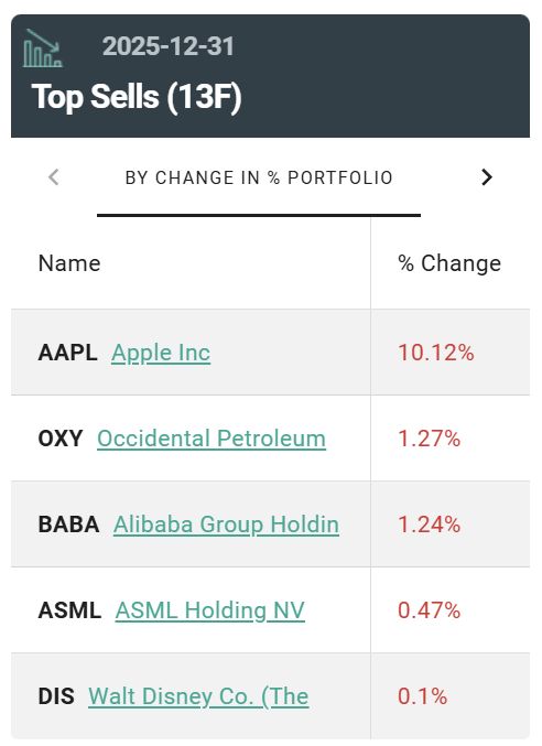 【导读】段永平四季度持仓曝光 中国基金报记者 莫琳 根据13F持仓披露情况,和巴菲特旗下的伯克希尔一样,段永平管理的H&H International Investment在 2025年第四季度也减持了苹果。 此外,值得一提的是,段永平正大举押注AI。其不仅大幅加仓英伟达,还建仓买入了CoreWeave、 Credo和Tempu三只AI产业链股票。 大手笔减持苹果 13F持仓披露显示,2025年四季度,段永平减持了苹果、西方石油、阿里巴巴、迪士尼、阿斯麦。 其中,苹果虽然仍是段永平的头号重仓股,但是减持幅度超过持仓的7%,共计减持247.06万股。 综合来看,段永平早在2011年就买入并长期重仓持有苹果。当时他列出了喜欢苹果的五大理由,包括极 致的用户体验、成熟的平台生态、单一产品模式、高效营销以及巨大的市场潜力。他认为,苹果的生意 模式比可口可乐更好,因为用户忠诚度高,提价后用户仍会购买,这构成了强大的"护城河"。 不过,去年一季度,段永平就大幅减仓苹果,卖出664万股;二季度小幅加仓89.44万股;三季度减持 28.95万股;四季度再次大手笔减仓。 在2025年第一季度建仓英伟达之后,段永平在第四季度突然 ...