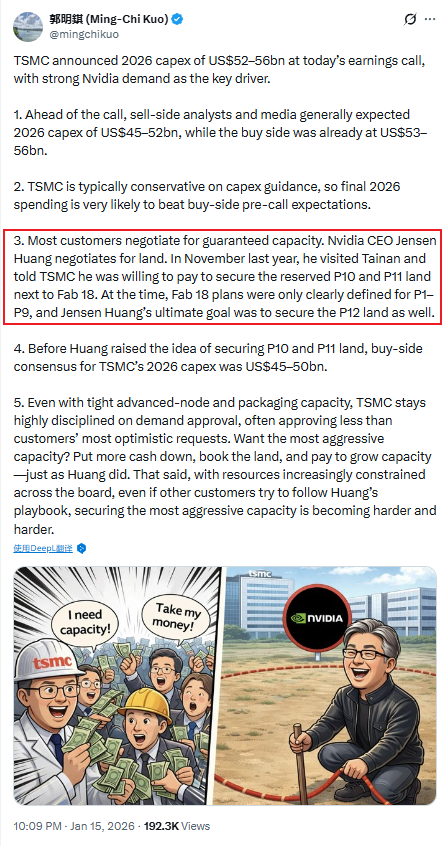当科技巨头们还在为台积电的晶圆产能激烈竞争时,英伟达CEO黄仁勋已经将目光投向了更长远的目标 ——直接锁定台积电未来工厂的土地。这一策略凸显出英伟达在AI芯片需求爆发背景下,正试图从根 本上确保其供应链安全。 1月15日,天风国际证券分析师郭明錤发推文称,"大多数客户协商的是保证产能,而黄仁勋协商的是土 地。"郭明錤指出,在去年11月访问台南时,黄仁勋向台积电表示愿意付费确保Fab 18厂区旁预留的P10 和P11地块,其最终目标是连P12地块也一并拿下。当时,Fab 18的规划仅明确定义到P1至P9。 产能争夺战重塑客户格局 根据Culpium的分析和供应链消息人士透露,英伟达可能在2025年至少一到两个季度超越苹果,成为台 积电最大客户。虽然台积电首席财务官黄仲达拒绝就客户排名变化置评,但公开数据已经说明问题。 这一举措正值台积电宣布2026年资本支出将达到520亿至560亿美元的创纪录水平,远超市场此前预期的 450亿至520亿美元。台积电在财报电话会议上明确表示,英伟达的强劲需求是推动这一支出增长的关键 驱动力。 与此同时,苹果等传统大客户正面临产能获取压力,英伟达可能已在2025年部分季度超越苹果成 ...