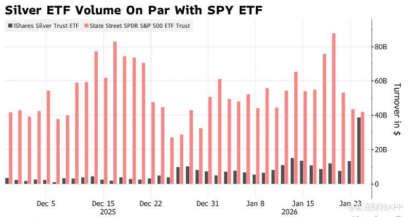 Group 1 - Recent extreme surge in silver prices has led to a dramatic increase in trading volumes of related products, with iShares Silver Trust (SLV.US) recording nearly $40 billion in trading volume on Monday, comparable to major ETFs like SPDR S&P 500 ETF [1] - The average daily trading volume of the silver ETF was around $2 billion a few months ago, but it has rapidly increased to approximately $10 billion since late December last year, indicating explosive growth [4] - Silver prices have more than doubled since 2025, with a nearly 60% increase in January alone, potentially marking the largest monthly gain since 1979, showcasing a "crazy" market trend [4] Group 2 - The strong performance of silver has also positively impacted other commodities and related assets, with gold prices rising about 18% and the MSCI Global Metals and Mining Index increasing by 19% this year, reflecting a resonance between market risk aversion and resource prices [4] - Analysts warn that the current surge in demand and trading volume in the silver market is increasingly driven by speculative funds rather than fundamental factors, indicating a shift in market dynamics [4] - The influx of capital and prevalence of momentum trading may lead to a self-reinforcing rally in silver trading, which could ultimately collapse under its own weight if market sentiment reverses, highlighting potential price correction risks [4]