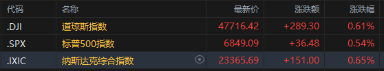 周五(11月28日),美国股市逢感恩节次日提早三小时收盘,三大指数连续第五个交易日上涨。 截至收盘,道琼斯指数涨0.61%,报47716.42点;标普500指数涨0.54%,报6849.09点;纳斯达克综合指数涨0.65%,报23365.69点。 威廉姆斯表态后,美联储12月降息25个基点的几率大幅上升。芝商所"美联储观察"工具显示,市场预计该行12月会议上降息25个基点的概率 为86.9%。 Zacks Investment Management客户投资组合经理Brian Mulberry评论道:"情绪又回到了风险偏好之中,因为市场现在有80%到85%的把握,美 联储将在几周内降息。" Sevens Report Research创始人Tom Essaye写道,"目前来看,数据支持美国经济软着陆,这也促成了感恩节前股市的持续上涨。" "然而,当前经济形势仍存在诸多未知因素,鉴于近几个月来政府数据匮乏,经济可能并不像投资者预期的那样强劲,这其中暗藏着风险。" 先前美股整体走弱部分源于市场对人工智能公司的未来盈利能力存在疑虑,科技股的回调拖累了大盘。但随着多家投行重申对该领域的信 心,美股得以重拾涨势。 热门股 ...
