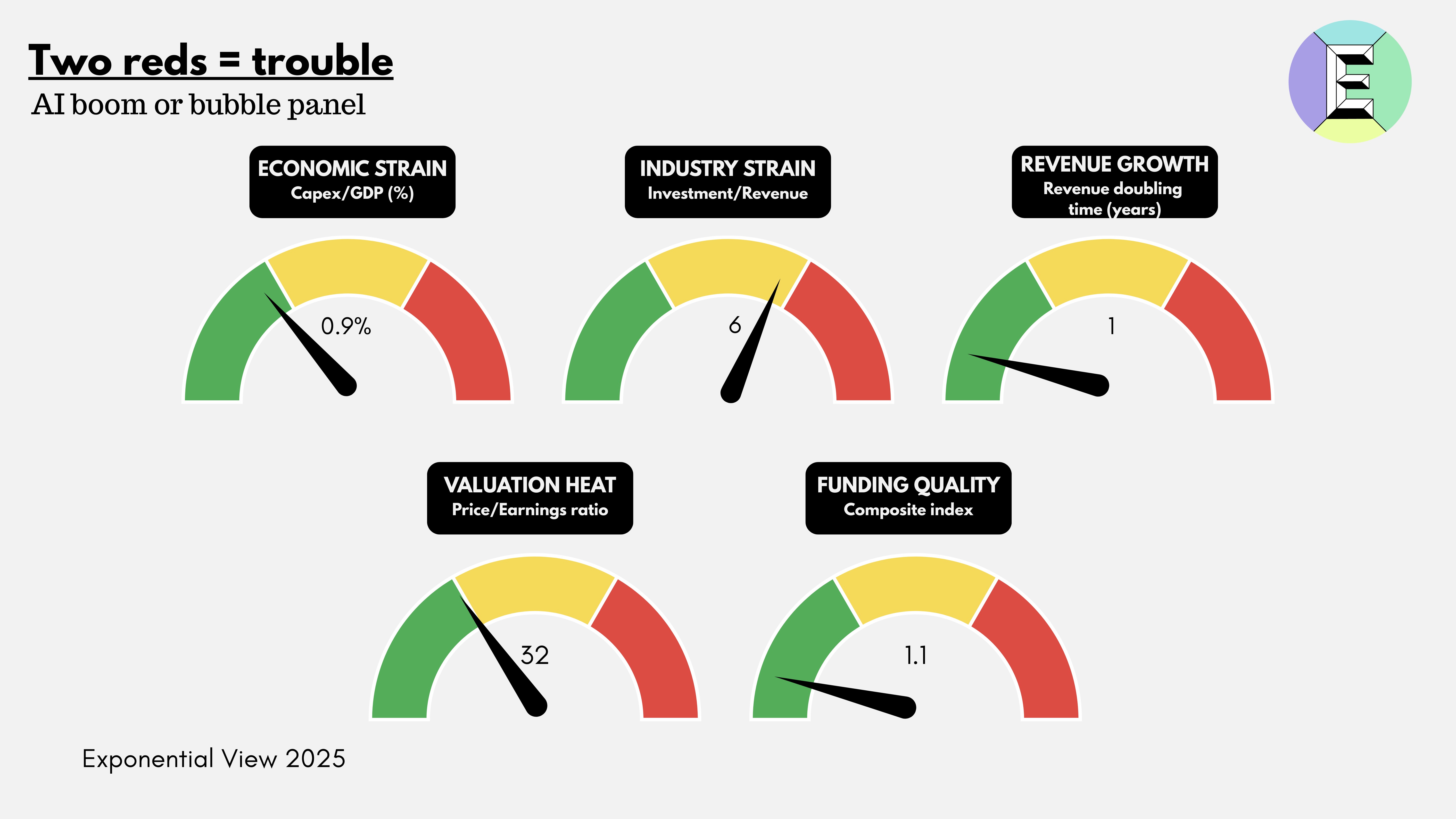 神译局是36氪旗下编译团队,关注科技、商业、职场、生活等领域,重点介绍国外的新技术、新观点、新风向。 编者按:人人都在谈AI泡沫,但没人说得清楚。本文用包含5个指标的框架告诉你:现在不是泡沫,但真正的危险信号是什么呢?文章来自编译。 一个月前,我开始着手回答一个看似简单的问题:人工智能是泡沫吗? 自2024年以来,当我在世界各地的活动中发表演讲时,人们一直在问我这个问题。 尽管华尔街的银行家们普遍认为这是一场投资热潮,但在欧洲和美国的会议室与大会堂里,越来越多的人开始提出这个问题。 有些人已经下定了决心。加里·马库斯(Gary Marcus)称其为"泡沫顶峰"。《大西洋月刊》警告说,"我们目前可能正在经历一场人工智能泡沫,投资者的兴 奋情绪已经远远超出了该技术近期的生产力效益。如果这个泡沫破裂,其后果可能让互联网泡沫的崩溃都相形见绌——而且遭受损失的将不仅仅是科技巨头 和他们的硅谷支持者。"《经济学人》则表示,"潜在的代价已经高得惊人。" 理解这类问题的最佳方式是建立一框架,一个可以随着新证据的出现而不断更新的框架。构建这个框架花费了我数十个小时进行数据分析、建模,并与投资 者和高管进行了大量对话。 本文就是 ...