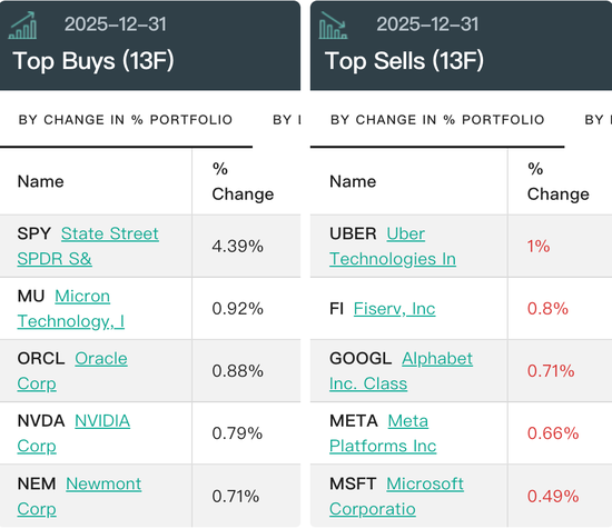 Core Insights - Bridgewater, the world's largest hedge fund, disclosed its U.S. stock holdings report (13F) as of the end of 2025, showing significant investments in technology stocks and gold mining companies while reducing positions in major tech firms like Google and Microsoft [1][6]. Holdings Overview - As of the end of 2025, Bridgewater's U.S. stock portfolio was valued at approximately $27.4 billion, reflecting a growth of over 7% from $25.5 billion at the end of Q3 2025 [1][6]. - The top holdings included SPDR S&P 500 ETF (SPY), iShares S&P 500 ETF (IVV), NVIDIA, Lam Research, Salesforce, Google (GOOGL), Microsoft, Amazon, Adobe, and GE Vernova, indicating a strong focus on AI and technology sectors [2][4]. Investment Actions - In Q4 2025, Bridgewater significantly increased its holdings in SPY by 1.89 million shares, NVIDIA by approximately 1.36 million shares, Amazon by 0.82 million shares, Oracle by 0.15 million shares, and Micron by 0.89 million shares [4][9]. - The fund also made substantial investments in gold mining companies, acquiring about 1.92 million shares of Newmont Mining and 1.88 million shares of Barrick Mining, both of which saw significant stock price increases in Q4 2025 [4][10]. Economic Outlook - Bridgewater's report highlighted that the capital expenditure surge in artificial intelligence (AI) is expected to provide crucial support for U.S. economic growth in the coming years, with many secondary effects not yet fully priced in by the market [10]. - Looking ahead to 2026, the firm believes that the impact of AI capital expenditure on the macroeconomic environment is one of the most underestimated changes, affecting specific sectors through pathways like electricity, core components (e.g., storage chips), and raw materials (e.g., copper, aluminum) [5][10].