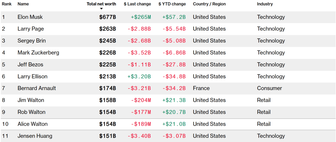 | Rank | Name | Total net worth D | $ Last change | $ YTD change | Country / Region | Industry | | --- | --- | --- | --- | --- | --- | --- | | 1 | Elon Musk | $677B | +$265M | +$57.2B | United States | Technology | | 2 | Larry Page | $263B | -$2.88B | -$5.54B | United States | Technology | | 3 | Sergey Brin | $245B | -$2.68B | -$5.08B | United States | Technology | | ব | Mark Zuckerberg | $226B | -$3.52B | -$6.86B | United States | Technology | | 5 | Jeff Bezos | $225B | -$1.11B | -$27.8B | United States | ...
