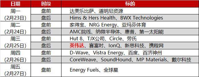 与此同时,来自伊朗、美国官员以及一些海湾国家和欧洲国家外交官的消息显示,随着美国和伊朗之间谈判陷入僵局,两国军事冲突风险正在加大。 下周周中,特朗普将发表国情咨文。先前白宫新闻秘书卡罗琳·莱维特未透露,特朗普是否计划在国情咨文演讲中,阐明对伊军事行动的目标与理由。 | 标的 | 时段 日期 | | --- | --- | | 达美乐比萨、道明尼资源 | 周一 | | 盘后 Hims & Hers Health. BWX Technologies | (2月23日) | | 盘前 家得宝、NRG Energy、亚玛芬体育 | 周二 | | 盘后 AMC院线、纳微半导体、惠普、第一太阳能 | (2月24日) | | Hut 8、TJX公司、Circle、劳氏 | | | 盘后 英伟达、塞富时、IonQ、新思科技、携程网 | (2月25日) | | 儒前 D-Wave、Vistra Energy、百度、百济神州 | 周四 | | 盘后 CoreWeave、SoundHound、MP Materials、戴尔科技 | (2月26日) | | 盘前 Energy Fuels、全球星 | 周五 | | | 周三 | | ...