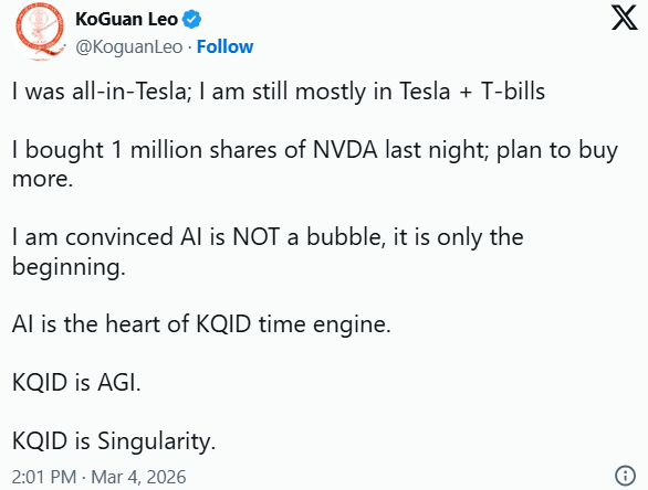 特斯拉(TSLA.O)最大投资者之一、曾自称是马斯克"铁粉"的亿万富豪李奥·柯根(Leo Koguan),在否 认人工智能泡沫担忧的同时,刚刚买入了100万股英伟达(NVDA.O)。 "我昨晚买了100万股英伟达,还计划继续买入,"总部位于新泽西的软件公司SHI International联合创始 人柯根周三在社交媒体发文称,"我坚信人工智能绝不是泡沫,这仅仅是开始。" 根据彭博亿万富豪指数,柯根的净资产约为128亿美元。英伟达周二收于每股180.05美元。按这一价格 计算,他为这些股票支付的金额约为1.8亿美元。 根据英伟达最新年度报告,截至2月20日,该人工智能芯片巨头共有243亿股流通股。虽然该股过去几个 月整体相对稳定,但由于市场担忧人工智能支出的可持续性,其股价较10月29日创下的207.04美元历史 收盘高点仍低11.5%。 特斯拉长期大股东:从"马斯克铁粉"到部分减仓 柯根的大部分财富来自他在特斯拉的持股,这些股份是他多年来持续积累的。 2021年,他成为特斯拉第三大个人股东,仅次于甲骨文(ORCL.O)联合创始人、前特斯拉董事会成员拉 里·埃里森(Larry Ellison)以及马斯克本人。 ...