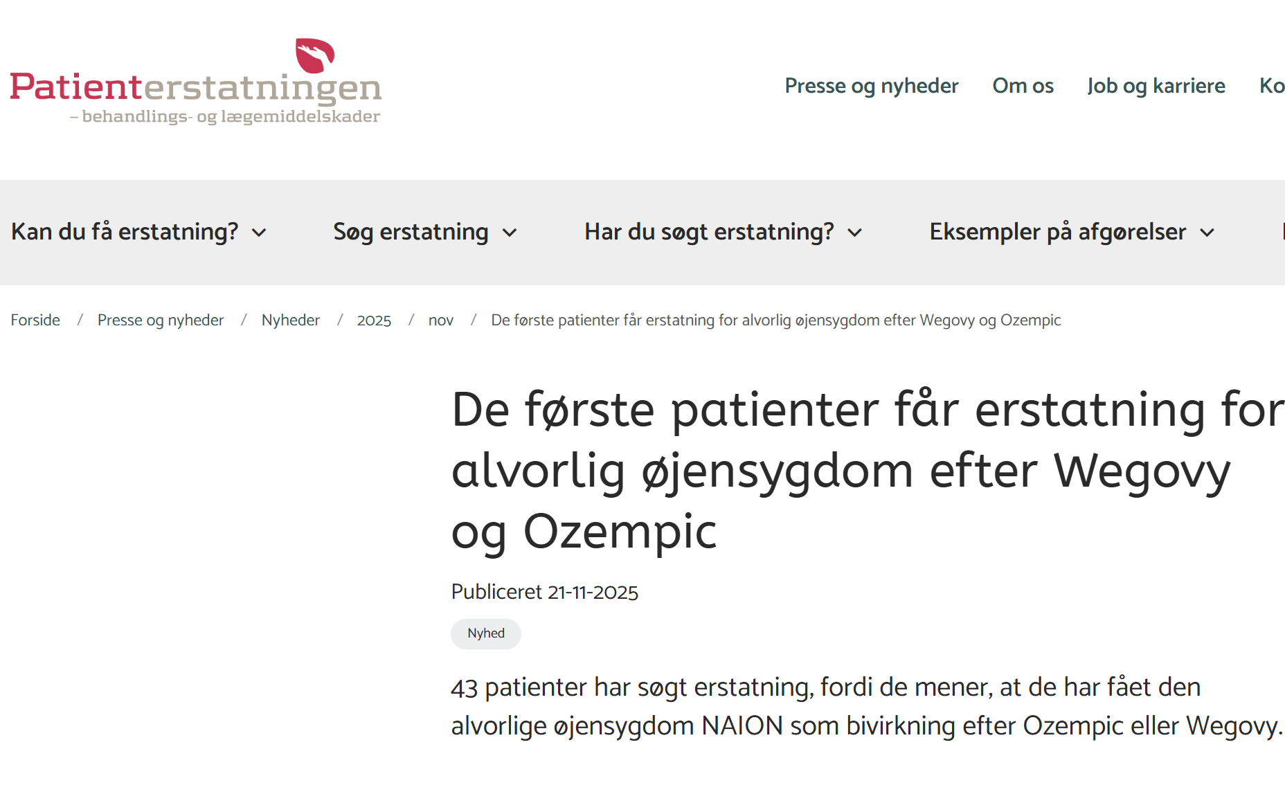 曾被吹成"躺瘦神器"的司美格鲁肽,现在翻车了。 43 名用过 Ozempic (司美格鲁肽注射液)或 Wegovy (司美格鲁肽减重版)的患者,集体因为一种叫 NAION 的眼病申请赔偿。 这病听起来绕口,后果却堪比晴天霹雳,直接攻击视神经前部,视力下降、视野缺损都是有可能发生。 它不仅能让你拉肚子、吐到怀疑人生,还可能直接夺走你的视力,让你一辈子活在模糊里。 01 视力风险爆发,4名患者赔偿金近90万 就在 11 月 21 日,丹麦患者赔偿协会官网突然爆出猛料。 首批 5 个案件已经宣判, 4 个都拿到了赔偿。 这可不是小打小闹, 4 个人的赔偿金加起来已经快 90 万人民币,要是因为失明丢了工作、没法开车走路,赔偿金额还可能往上涨。 要知道这药全球都卖疯了。 摩根士丹利测算到 2025 年底,全球用过的人都突破 5000 万了,其中近 2000 万人是冲着减肥来的,这背后藏着多少潜在风险? 而根据丹麦患者赔偿协会的说法,司美格鲁肽每 1 万名使用者中约有 1 人会受 NAION 影响。 5000 万人的基数摆在这里,万分之一就是 5000 个受害者。 事实上,相关风险早有预警。 2025 年 6 月 6 ...