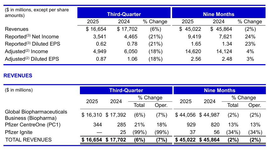 智通财经APP获悉,辉瑞(PFE.US)公布了好于预期的2025年第三季度业绩,同时上调了全年盈利预期。该公司表示,持续推进的成本削减措施 帮助弥补了销售增长放缓带来的压力,这也为其竞购减肥药初创公司Metsera(MTSR.US)提供了资金支持。 财报显示,辉瑞Q3营收同比下降6%至166.54亿美元,好于分析师普遍预期的165亿美元;调整后的净利润为49.49亿美元,同比下降18%;调整后的 每股收益为0.87美元,好于分析师普遍预期的0.64美元。 | ($ in millions, except per share | | | | | | | | --- | --- | --- | --- | --- | --- | --- | | amounts) | Third-Quarter | | | | Nine Months | | | | 2025 | 2024 | % Change | 2025 | 2024 | % Change | | Revenues | $ 16,654 | $ 17,702 | (6%) | $ 45,022 | $ 45,864 | (2%) | | Reported(3) ...