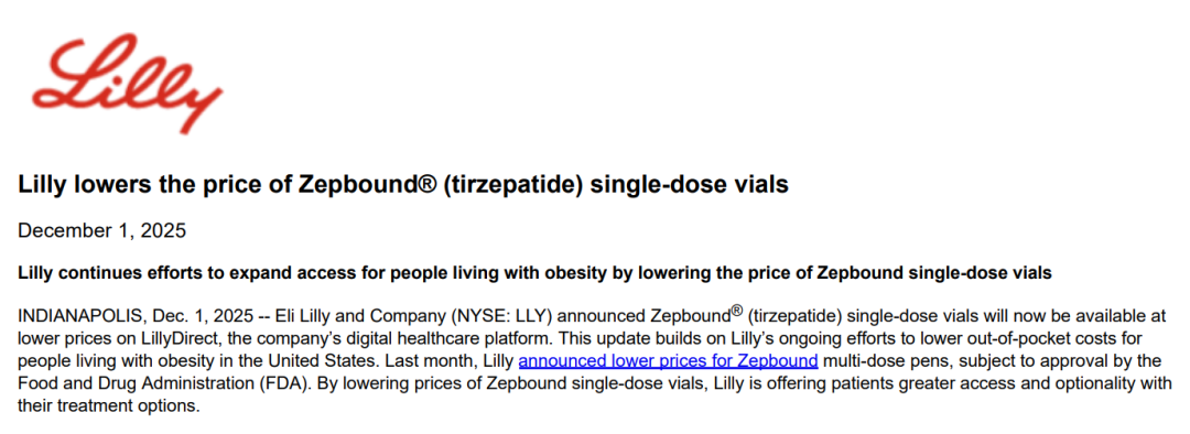 智通财经APP获悉,随着与竞争对手诺和诺德(NVO.US)的竞争日趋激烈,礼来(LLY.US)再次下调其减 肥药Zepbound入门剂量的价格。 礼来在一份声明中表示,自周一起,现金自费购药者购买最低剂量的Zepbound每月费用为299美元,较 之前价格优惠约50美元。次高剂量的价格将降至每月399美元,较此前现金自费价格下调约20%。礼来 未调整更高剂量的价格,该系列仍维持每月499美元的售价。 礼来与诺和诺德在利润丰厚的全球肥胖症治疗市场中展开正面竞争,分析师预计该市场规模到本十年末 将达到1000亿美元。两家公司一直在寻找竞争优势,包括与管控美国药品福利的机构达成协议、为现金 自费客户提供折扣,以及近期推出的直接面向雇主的新计划。 与此同时,长期备受关注的减肥药价格正面临来自特朗普政府降低美国民众用药成本行动所带来的更大 压力。 周二,白宫宣布已通过谈判为联邦老年医保计划患者争取到Ozempic和Wegovy高达71%的折扣。该降价 措施将于2027年生效。 此外,诺和诺德与礼来均在与政府达成的协议中同意降低其在美国的价格,该协议同时适用于联邦医保 患者和现金自费客户。根据协议,礼来将下调Zepbou ...