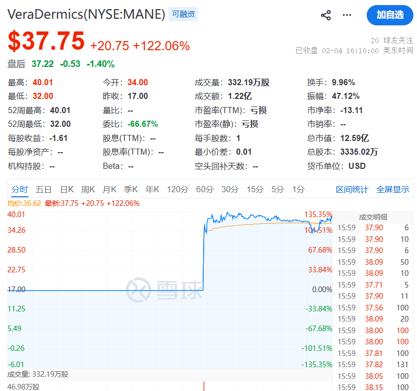 1、VeraDermics(MANE) 首日开盘,VeraDermics每股报34美元,较发行价上涨100%。盘中高位盘旋,至收盘每股报37.75美元,涨幅 122.06%,总市值12.59亿美元。该公司在纽交所上市,股票代码MANE。 该公司此次以每股17美元,发行了1508万股,募集了2.56亿美元。根据招股书,VeraDermics计划将此次募集资金用于 支持医生教育、品牌推广活动、营销、商业前期和商业启动活动、建立基础设施以及生产商业供应品、业务拓展活动 和其他一般性公司用途。 VeraDermics是一家临床后期的生物制药公司,专注于开发创新疗法,以解决普遍存在的美学和皮肤病治疗难题。该 公司正在研发一种名为 VDPHL01 的口服、非激素性疗法,用于治疗男性和女性的PHL。VeraDermics尚无收入,2025 年前九个月亏损4815万美元。 2、TG-17(OBAI) 当地时间2026年2月4日,VeraDermics、TG-17和Colombier Acquisition III 同日在美股上市,如下: | 最高: 38.50 | 今开:20.00 | 成交量: 96872股 | 换手:0. ...