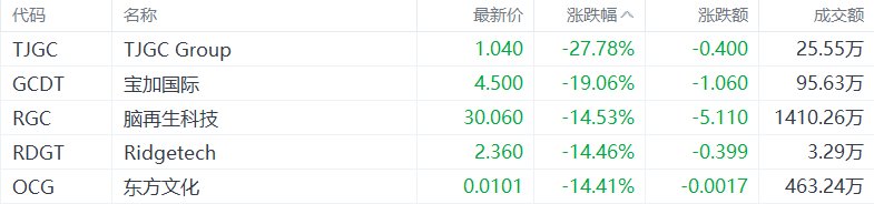 中概股收盘跌幅居前的个股为:TJGC Group跌27.78%,宝加国际跌19.06%,脑再生科技跌14.53%,Ridgetech跌 14.46%,东方文化跌14.41%。(格隆汇) | 代码 | 名称 | 最新价 | 涨跌幅 へ | 涨跌额 | 成交额 | | --- | --- | --- | --- | --- | --- | | TJGC | TJGC Group | 1.040 | -27.78% | -0.400 | 25.55万 | | GCDT | 宝加国际 | 4.500 | -19.06% | -1.060 | 95.63万 | | RGC | 脑再生科技 | 30.060 | -14.53% | -5.110 | 1410.26万 | | RDGT | Ridgetech | 2.360 | -14.46% | -0.399 | 3.29万 | | OCG | 东方文化 | 0.0101 | -14.41% | -0.0017 | 463.24万 | ...