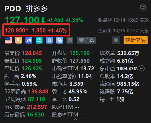 | PDD 拼多多 | | | | --- | --- | --- | | 127.100 ↓-0.450 -0.35% | | 收盘价 10/14 16:00 美东 | | 128.950 + 1.850 +1.46% | | 盘前价 10/15 04:57 美东 | | 三 7 24 4 5 5 5 日 0 日 0 日 0 日 0 日 0 1 2 1 1 1 | | ● 快捷交易 | | 最高价 128.045 | 开盘价 125.120 | 成交量 536.65万 | | 最低价 124.905 | 昨收价 127.550 | 成交额 6.81亿 | | 平均价 126.925 | 市空室 IM 1372 | 总市值 1804.37亿 (…) | | 振 幅 2.46% | 市盈率(静) 11.94 | 总股本 14.2亿 | | 换手率 0.69% | 市净率 3.559 | 流通值 985.15亿 | | 52周最高 136.840 委 比 45.95% | | 流通股 7.75亿 | | 52周最低 87.110 | 量 比 0.52 | 每 手 1股 | | 历史最高 212.597 | 股息T ...