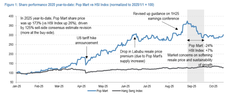 Core Viewpoint - Morgan Stanley believes that Pop Mart's fundamentals have not changed but have become stronger, and the market's panic presents an excellent allocation opportunity [1] Group 1: Rating and Price Target Adjustment - On October 15, Morgan Stanley upgraded Pop Mart's rating from "Neutral" to "Overweight" and raised the target price from HKD 300 to HKD 320 [1] - The adjustment is based on two key factors: the sustained popularity of Labubu and the success of the new IP "Twinkle Twinkle" [1] Group 2: Labubu's Performance - Labubu's production capacity has increased tenfold compared to Q1 2025, yet the Labubu 3.0 and Mini Labubu series remain sold out at all sales points, dispelling market concerns about demand sustainability [2] - The resale price of the Halloween "Why So Serious" plush series featuring Labubu reached a premium of 290% in the secondary market [3] Group 3: New IP Development - The new IP "Twinkle Twinkle" is rapidly becoming a new growth driver, with products from a recent Halloween series selling out within minutes on major online platforms [4] - The secondary market premium for "Twinkle Twinkle" reached 130%, indicating strong demand and a real fan base [5] Group 4: Market Sentiment and Valuation - Pop Mart's stock price has dropped 24% from a recent high of HKD 335.40 to HKD 254, while the Hang Seng Index has risen by 7% during the same period [6][7] - Morgan Stanley predicts that Pop Mart's sales and adjusted profits will grow by 165% and 276% year-on-year in 2025, respectively, with continued growth in 2026 [10] Group 5: Global Supply Chain Strategy - Morgan Stanley believes that the financial impact of global trade tensions on Pop Mart will be limited, as the company has prepared inventory for the 2025 holiday season [11] - The company has the ability to raise prices to offset rising costs, having successfully increased blind box prices by 12% and plush toy prices by 27% in April 2025 [11] - Pop Mart is planning six global manufacturing centers to support long-term global expansion, with sales contribution from the Americas expected to rise from 21% in 2025 to 28% in 2027 [13]
