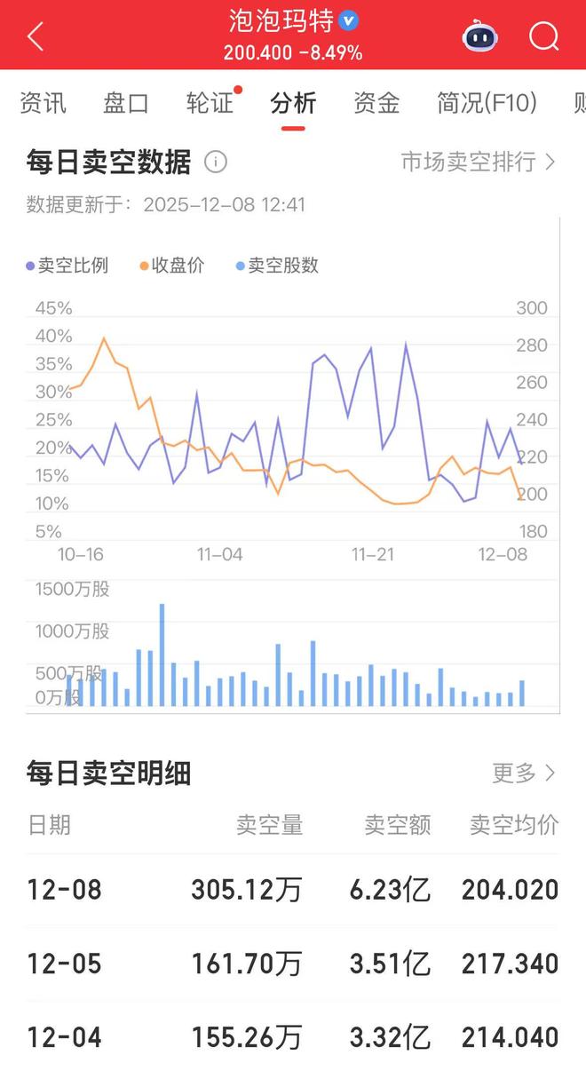 12月8日,泡泡玛特(9992.HK)港股盘中股价跌超9%,引发市场关注。截至收盘,泡泡玛特港股报 200.40港元/股,跌8.49%,总市值为2691亿港元,较上个交易日蒸发约250亿港元,股价较8月高点回落 超40%。 | 日期 | 卖空量 卖空额 卖空均价 | | --- | --- | | 305.12万 6.23亿 204.020 | 12-08 | | 161.70万 3.51亿 217.340 | 12-05 | | 155.26万 3.32亿 214.040 | 12-04 | 德银12月1日研报指出,为应对需求激增,泡泡玛特将Labubu产能从上半年的1000万只大幅提升至年底 月均5000万只。该行警示,对于依赖独特设计与稀缺性驱动的潮流玩具品牌而言,大规模量产往往是热 度消退的前兆。 当前,市场看空泡泡玛特的情绪正持续升温。同花顺iFinD数据显示,自12月2日以来,泡泡玛特卖空股 数从111.06万股升至305.12万股,卖空金额从2.41亿港元升至6.23亿港元,飙升158%。其中12月8日,泡 泡玛特卖空金额较上一交易日大幅飙升77%,未平仓卖空股数超8400万股。此前,11月21 ...