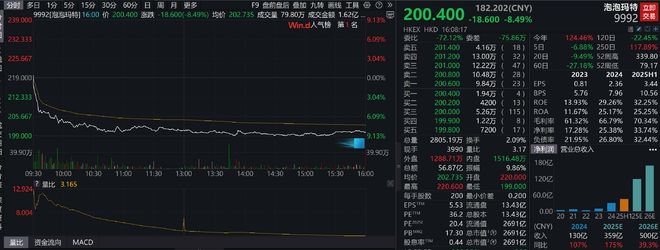 图片来源:Wind 2025年第三季度,泡泡玛特整体收益同比增长245%-250%。具体来看,中国收益同比增长185%-190%, 海外收益同比增长365%-370%,其中亚太同比增长170%-175%;美洲同比增长1265%-1270%;欧洲及其 他地区同比增长735%-740%。同期,泡泡玛特线下渠道收益同比增长130%-135%,线上渠道收益同比增 长300%-305%。 然而,业绩上涨股价却下跌。财报发布当日,泡泡玛特股价报收250.4港元/股,跌幅8.08%,市值一天 内蒸发295.46亿港元,缩水至3362.73亿港元。 国海证券针对泡泡玛特所发布的研报中指出,其多维度运营IP并变现。且产品品类扩张逻辑持续验证, 海外市场表现持续超预期。但需警惕"IP续约不及预期""单一IP依赖"的风险,此外,还包括供应链供货 及质量控制、人力/租金/营销成本增加、市场竞争加剧、估值中枢下移、海外扩张不及预期等。 12月8日,泡泡玛特(09992.HK)股价单日跌幅超8%,创近8个交易日新低。截至收盘,股价报200.4港 元,较8月高位以来跌近40%,市值蒸发逾1600亿港元。 值得注意的是,市场看空情绪持续升温 ...