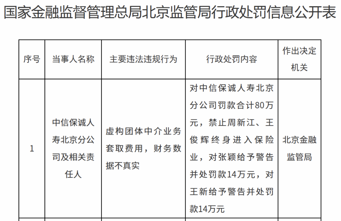 | 序号 | 当事人名称 | 主要违法违规行为 | 行政处罚内容 | 作出决定 机关 | | --- | --- | --- | --- | --- | | 1 | 寿北京分公 | 套取费用,财务数 | 对中信保诚人寿北京 | | | | | | 分公司罚款合计80万 | | | | 中信保诚人 | 虚构团体中介业务 | 元,禁止周新江、王 | | | | | | 俊辉终身进入保险 | 北京金融 | | | 司及相关责 | | 业,对张颖给予警告 | 监管局 | | | | 据不真实 | | | | | 任人 | | 并处罚款14万元,对 | | | | | | 王新给予警告并处罚 | | | | | | 款14万元 | | 截图:国家金融监督管理总局官网 凤凰网财经讯 10月11日,据国家金融监督管理总局官网消息显示,中信保诚北京分公司因虚构团体中介业务套取费用、财务数据不真实,被罚款80万元。 相关责任人周新江、王俊辉被终身禁止进入保险业,张颖、王新受到警告并处罚款14万元。 ...