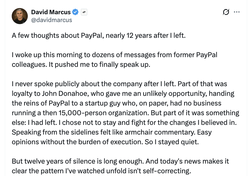 利润和营收不及预期,股价应声下跌——日前,国外科技支付巨头 PayPal 交出了一份让市场有所失望的财报。 几乎在同一时间,公司火速宣布"换帅",其 CEO Alex Chriss 离任,由董事会成员、前 HP CEO Enrique Lores 接任。 这一连串动作来得非常迅速,也似乎对外在释放出一个清晰的信号:董事会已经失去了耐心。 回顾历史,PayPal 曾是全球最早实现大规模在线支付的公司之一,也是无数跨境电商、开发者和中小商户绕不开的 支付平台,素有"美版支付宝"之称。即便在 Apple Pay、Stripe 等新玩家崛起之后,PayPal 依然掌握着庞大的用户规 模、商户网络和支付流水。 对于一家曾长期被视为全球在线支付"基础设施"的公司来说,如此密集的震荡并不常见。这也让外界开始重新审 视: PayPal 是从什么时候开始,走到今天这一步的? 对此,曾在 2012 至 2014 年担任 PayPal 总裁的 David Marcus,离开公司十二年后首次打破沉默,于 X 平台上发长 文,系统性地回顾自己眼中的 PayPal 的这些年。 David Marcus 谈及了自己 12 年前离开 Pay ...