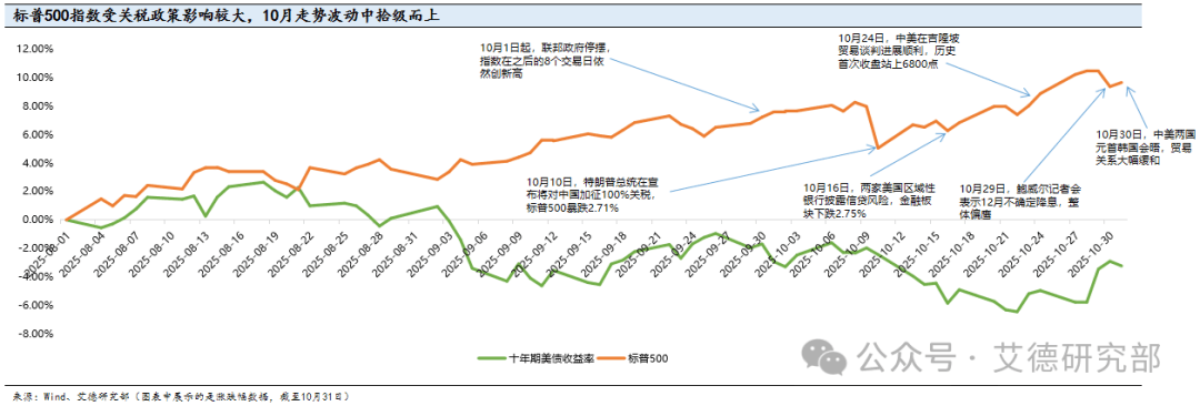 内容摘要 ▍▍ 正文 ▍▍ ▍复盘10月走势,受关税政策影响较大 10月1日至今,美国共和、民主两党未能就临时拔款法案达到一致,联邦政府仍在停摆。历史上联邦政府曾停摆数次,市场已具备丰富经验,此次市场预 计联邦政府停摆将对GDP增长产生轻微负面影响,股市对此反应平淡,停摆初期标普500在不断创历史新高。 10月10日,特朗普总统在社交媒体宣布将对中国加征100%关税,引发市场对中美经贸摩擦再次升级的担忧,标普500暴跌2.71%,创对等关税以来最大单 日跌幅。之后数日特朗普总统、万斯副总统及财政部长贝森特相继释放缓和信息,无意与中国脱钩断链,TACO交易再现;中旬大盘在反弹后进入横盘振 荡格局。 10月14日,美联储主席鲍威尔在费城国家商业经济协会表示,金融体系流动性状况正逐步趋紧,量化紧缩(QT)计划即将接近尾声。 主要事件:10月美股市场按时间先后顺序主要经历了联邦政府关门、特朗普总统突然在社交媒体宣布对中国加征100%关税、美国两家区域银行披露 信贷风险、中美贸易代表在吉隆坡谈判进展顺利、鲍威尔主席记者会表示12月不确定降息、中美两国元首韩国会晤,对美股影响最大的是中美贸易 政策的变化。 12月降息存变 ...