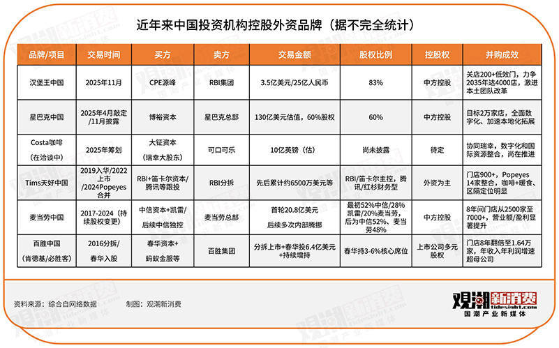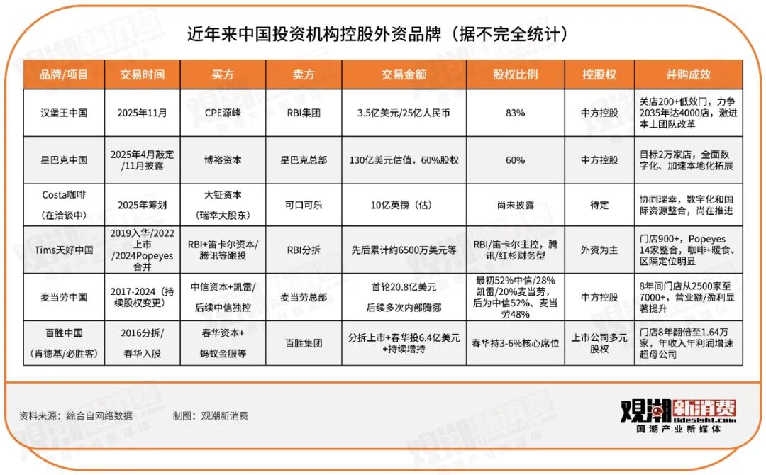 星巴克中国易主,汉堡王被收购,麦当劳改姓"中"……这不仅是资本所有权的变更,更是一场残酷的市场规则重构。 为什么昔日的"老师"如今需要"学生"来救场?背后是决策链失灵、数字化代差与后发优势的彻底逆转。 我们将深度拆解这场本土化涅槃,用资深投资人的视角,为你揭示:这不再是水土不服,而是一场生存之战。 星巴克中国60%股权易主博裕资本,汉堡王中国被CPE源峰收入囊中——国际消费品牌正在集体换上中国舵手。 这不是普通的所有权更迭,而是一场关乎生存的本土化涅槃。过去凭借品牌光环就能轻松盈利的时代已经结束,深陷增长困境的国际品牌们,如今纷纷向 中国资本敞开大门,正寄望于中国资本的手术刀,为自己重塑竞争力。 这背后揭示是一场彻底的市场规则重构。 | | | | | 近年来中国投资机构控股外资品牌(据不完全统计) | | | | | --- | --- | --- | --- | --- | --- | --- | --- | | 品牌/项目 | 交易时间 | 买方 | 卖方 | 交易金额 | 股权比例 | 控股权 | 并购成效 | | 汉堡王中国 | 2025年11月 | CPE源峰 | RBI集团 | 3.5亿美元/2 ...