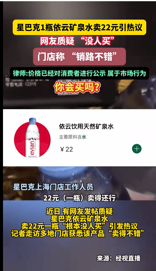 近日,有网友发帖质疑星巴克以22元一瓶的价格售卖依云矿泉水"根本没人买",引发热议。 律师表示,价格已经对消费者进行了公示,并且不存在强迫行为,这就属于市场行为。 部分网友认为,顾客购买高价矿泉水有虚荣之嫌,而星巴克的高定价是为了提升品牌价值。华中师范大 学社会学院梅志罡教授认为,这两种观点均不妥当,"星巴克有其产品定位,每个人基于不同的消费动 机、不同的产品支付能力,来选择自己认为适合的产品,这恰恰是一直消费个性化的表现,不能轻易给 别人贴标签。" 在网购平台,依云矿泉水的售价约为每瓶5到7元。记者联系到广州一家星巴克门店,工作人员确认,店 内依云矿泉水售价确为22元一瓶。 星巴克上海门店工作人员称,该矿泉水卖得还不错,有些办公或谈生意的人不想喝咖啡就会点矿泉水。 面对价格差异,该工作人员称大概是进货渠道不一样,依云矿泉水一直是这个价格,也一直有人点。 来源:海报新闻、都市现场 ...