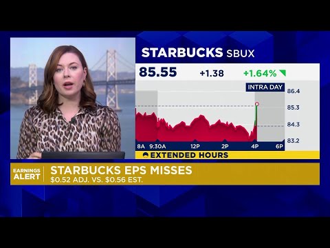 Uh but we have more earnings to bring you. Starbucks results are out. Kate Rogers has those numbers.Hi Kate. Hey Morgan. So the stock a little bit higher here as you can see by more than one and a half%.A mixed fourth quarter for Starbucks. Uh EPS a miss here. 52 cents adjusted versus estimates of 56 cents.Revenues though would beat 9.6% billion for the quarter versus the 9.35% billion estimated. And that's even with the labor investments that the company is making right now. Comps turning positive globally ...