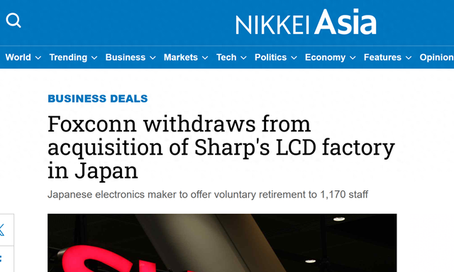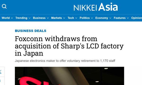 面板价格疲软致收购告吹,富士康放弃夏普日本LCD工厂收购计划