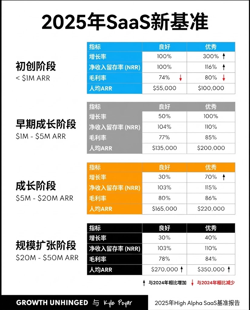 神译局是36氪旗下编译团队,关注科技、商业、职场、生活等领域,重点介绍国外的新技术、新观点、新风向。 编者按:市场趋稳只是表象。AI原生公司增速快了3倍,却也在吞噬毛利与研发岗。SaaS旧逻辑失效,一场残酷的效率战争已至。文章来自编 译。 2025 年 SaaS 基准报告 在过去九年(!)的时间里,我调研了 5000 家私营 B2B 软件公司,试图通过这些数据通过这些数据弄清楚这个行业到底在发生什么。《SaaS 基 准报告》现已成为行业的一项年度"体检",用于把脉增长率、人员规模、定价策略和运营效率的最新动态。 我非常高兴能继续与我的朋友们——B2B SaaS 风险投资公司 High Alpha——共同发布这份报告。本次共有超过 800 家公司参与调研,创下了我们 的新纪录。 要点 1:你的表现如何?核心 SaaS 指标基准对比。 首先:我们总结了在增长率、净收入留存率 (NRR)、毛利率以及每全职员工 (FTE) 贡献 ARR 方面的"良好"(第 50 百分位)和"优秀"(第 75 百分 位)标准。 1. 高效增长矩阵。忘掉 LTV:CAC(客户终身价值与获客成本比率)吧,看看这个。 2. AI 增长故事。 ...