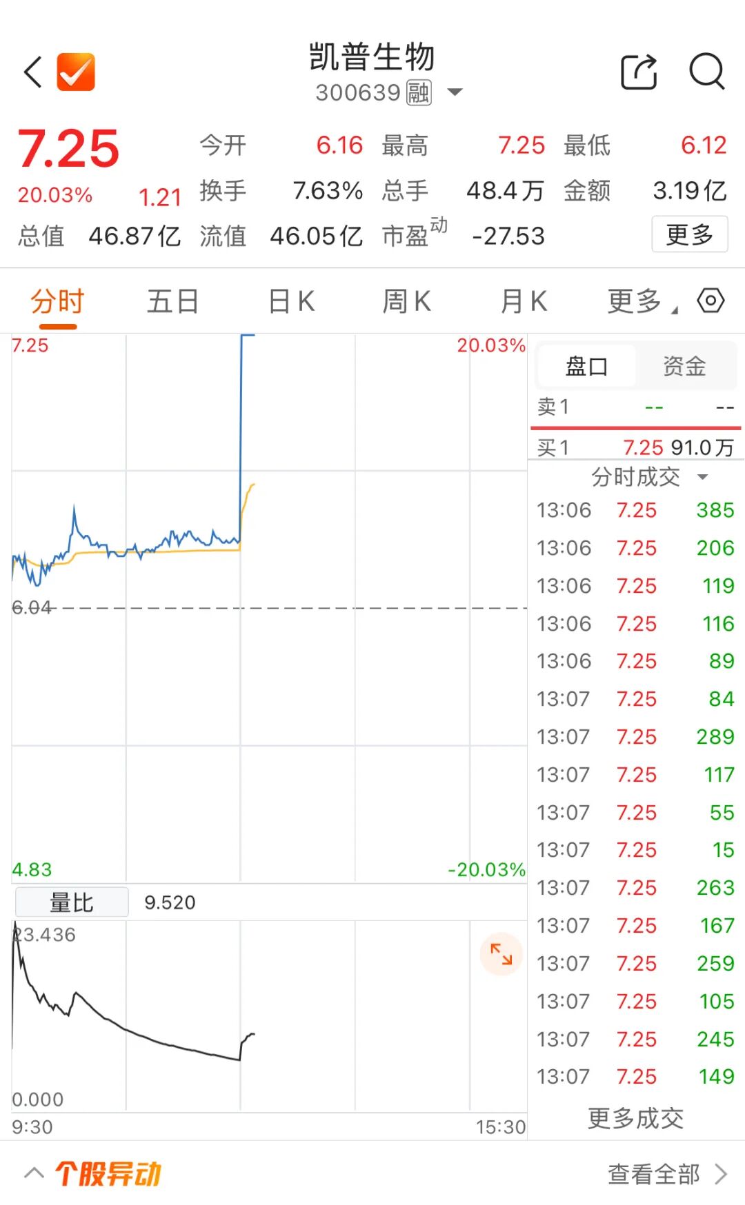 Group 1 - The flu sector experienced a significant surge, with Cap Bio (300639) hitting the daily limit of 20% increase in less than a minute, while other companies like Mike Bio, Jindike, and Oriental Bio rose over 10% [1] - Cap Bio opened at 6.12 and reached a high of 7.25, reflecting a 20.03% increase, with a total market value of 46.87 billion and a circulating market value of 46.05 billion [2][3] - Other notable performers in the flu sector included Hualan Vaccine, which increased by 20%, Mike Bio by 15.22%, and Jindike by 13.62% [3][4] Group 2 - Reports indicated that there are confirmed cases of Nipah virus infection in West Bengal, India, with five cases reported, including healthcare workers, leading to nearly 100 individuals being quarantined [4]