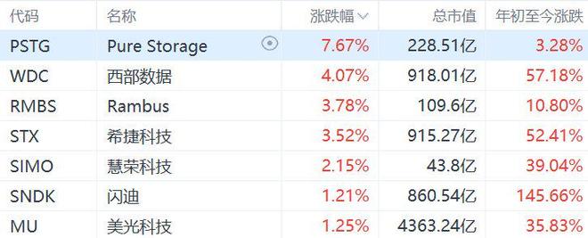 来源:格隆汇APP 格隆汇2月7日|美股存储概念股普涨,其中,Pure Storage涨超7%,西部数据涨4%,Rambus、希捷科 技涨超3%,慧荣科技涨超2%,闪迪、美光科技涨超1%。 | 代码 | 名称 | | 涨跌幅 √ | 总市值 | 年初至今涨跌 | | --- | --- | --- | --- | --- | --- | | PSTG | Pure Storage | (0) | 7.67% | 228.51亿 | 3.28% | | WDC | 西部数据 | | 4.07% | 918.01亿 | 57.18% | | RMBS | Rambus | | 3.78% | 109.6亿 | 10.80% | | STX | 希捷科技 | | 3.52% | 915.27亿 | 52.41% | | SIMO | 慧荣科技 | | 2.15% | 43.8亿 | 39.04% | | SNDK | 闪迪 | | 1.21% | 860.54亿 | 145.66% | | MU | 美光科技 | | 1.25% | 4363.24亿 | 35.83% | ...
