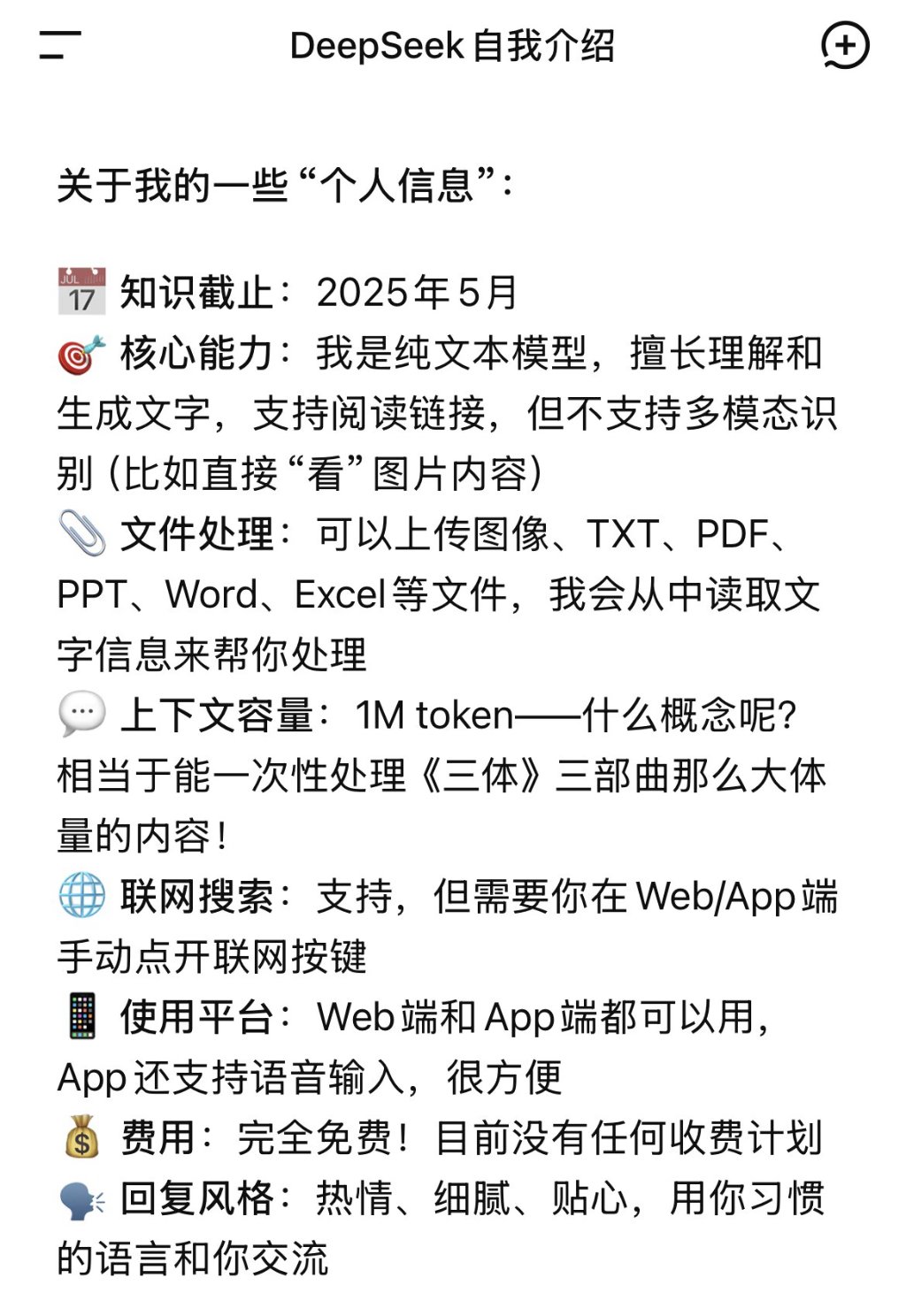 Group 1 - The core point of the article highlights the significant updates in the DeepSeek AI model, particularly its context processing capabilities and knowledge base freshness [1][3] - After updating to version 1.7.4, DeepSeek claims a context processing capacity of 1M, capable of handling the entire "Three-Body" trilogy [1] - The latest version, DeepSeek V3.2, released on December 1, 2025, shows an 8-fold increase in context capability to 128K compared to the previous version [3] Group 2 - The knowledge base of DeepSeek has been updated to reflect information up to May 2025, improving its relevance to significant events and technological advancements expected in late 2024 and early 2025 [3] - Currently, DeepSeek does not support multimodal capabilities, indicating a potential area for future development [3] - The official DeepSeek team has not made any public announcements or responses regarding these updates [3]