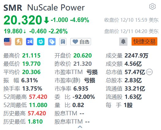 小型模块化反应堆公司NuScale Power(SMR.US)盘前续跌2.26%,报19.86美元;该股昨日收跌4.69%。消 息面上,花旗重申对NuScale Power的"卖出/高风险"评级,并将其目标价从37.5美元大幅下调至18.5美 元。花旗指出,短期内或存在利好因素推动公司股价走高,但长期来看,营收压力将持续显现。一方 面,现有合同相关收入呈下滑态势,另一方面,合作伙伴福陆持续减持套现,且NuScale需增发股权以 履行支付承诺。(格隆汇) | SMR NuScale Power | | 01 | | --- | --- | --- | | 20.320 + -1.000 -4.69% | | 收盘价 12/10 15:59 美东 | | 19.860 + -0.460 -2.26% | | 盘前价 12/11 04:20 美东 | | 三 5 24 号 ( 8 目 ( 白 ( ) 2 | | ● 快捷交易 | | 最高价 21.115 | 开盘价 20.620 | 成交量 2247.9万 | | 最低价 19.770 | 昨收价 21.320 | 成交额 4.56亿 | | 平均价 20.306 ...