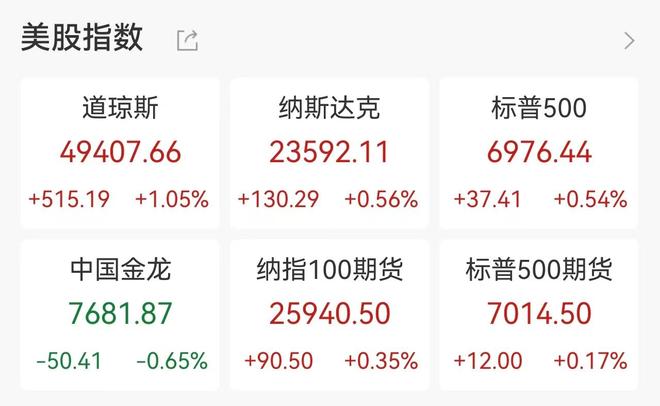 Group 1 - The U.S. stock market experienced a significant rebound, with the Dow Jones Industrial Average rising by 515.19 points, or 1.05%, closing at 49,407.66 points, while the S&P 500 index approached 7,000 points, closing at 6,976.44 points [1] - The storage chip manufacturers saw a notable increase in stock prices, driven by demand in the artificial intelligence sector, with SanDisk's stock soaring by 15.4%, Micron Technology rising by 5.5%, and Advanced Micro Devices increasing by 4% [1] - The volatility index (VIX) dropped over 6% after reaching a near two-week high, settling at 16.32 points [1] Group 2 - The precious metals market experienced heightened volatility, with COMEX gold futures for February delivery falling by 1.94% to $4,622.50 per ounce, and COMEX silver futures dropping by 1.93% to $78.77 per ounce, as trading intensified around the $80 mark [2]