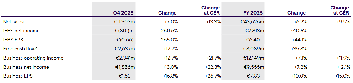 Core Insights - The company reported a Q4 sales growth of 13.3% at constant exchange rates (CER) and a business earnings per share (EPS) of €1.53, reflecting strong performance driven by new medicines and Dupixent [1][2]. Sales Performance - In Q4 2025, net sales reached €11.3 billion, marking a 7.0% increase year-over-year at actual exchange rates and a 13.3% increase at CER [5]. - For the full year 2025, net sales totaled €43.6 billion, with a 6.2% increase at actual exchange rates and a 9.9% increase at CER [5]. Earnings Performance - Business EPS for Q4 2025 was €1.53, up by 16.8% at actual exchange rates and 26.7% at CER [5]. - The full year 2025 business EPS improved to €7.83, reflecting a 10.0% increase at actual exchange rates and a 15.0% increase at CER [5]. Product Developments - The company launched three new medicines and vaccines in 2025, contributing to sales growth [3]. - Dupixent sales increased by 32.2% to €4.2 billion, while pharmaceutical launches increased sales by 49.4%, reaching €1.1 billion [4]. Regulatory Approvals and R&D - The company obtained ten regulatory approvals across various therapeutic areas, including immunology and rare diseases [4]. - Research and Development expenses reached €2.3 billion, up by 6.6%, indicating continued investment in innovation [4]. Future Guidance - For 2026, the company expects sales to grow by a high single-digit percentage at CER, with business EPS anticipated to grow slightly faster than sales [2][4]. - A share buyback program of €1 billion is planned for 2026 [2]. Financial Management - The company completed a €5 billion share buyback program and proposed a dividend of €4.12, up by 5.1% [4]. - Free cash flow for Q4 2025 was €2.6 billion, reflecting a 12.7% increase [5].