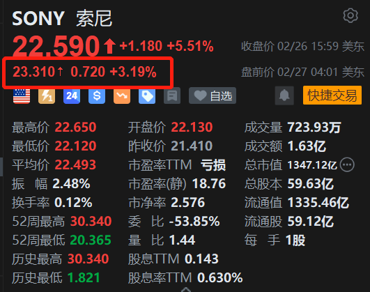 美股异动丨索尼盘前续涨超3% 公司提升日股回购金额至2500亿日元