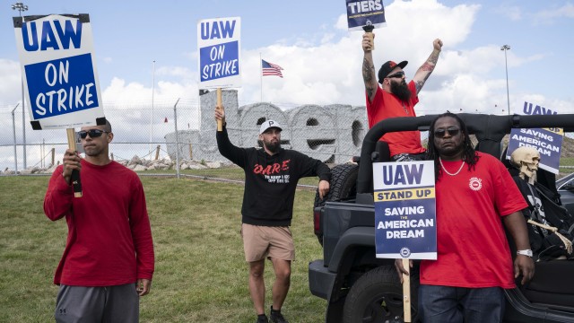 (L-R) United Auto Workers (U.A.W.) members Kaleb Delfine, Bryan Broecker, Michael Gatto and James Triplett picket outside the Jeep Plant on September 18, 2023 in Toledo, Ohio.Global auto giant Stellantis on Thursday reported a 10% year-on-year fall in profit in the second half of 2023, as six-week strikes at the so-called "Detroit Three" automakers hampered production in the group's North American profit epicenter.Adjusted operating income (AOI) came in at 10.2 billion euros ($10.96 billion) for the July to ...