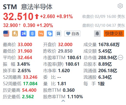 | STM 意法半导体 | 03 | | --- | --- | | 32.510 + +2.660 +8.91% | 收盘价 02/09 16:00 美东 | | 32.900 + 0.390 +1.20% | 盘前价 02/10 04:37 美东 | | 二 24 8 8 ~ 8 目 ♥自选 | ● 快捷交易 | | 最高价 33.000 | 开盘价 32.000 成交量 1678.68万 | | 最低价 31.960 | 昨收价 29.850 成交额 5.45亿 | | 平均价 32.464 | 市盈率TTM 180.61 总市值 288.94亿 … | | 振 幅 3.48% | 市盈率(静) 180.61 总股本 8.89亿 | | 换手率 2.65% | 市净率 1.620 流通值 206.18亿 | | 52周最高 33.246 | 委 比 -- 流通股 6.34亿 | | 52周最低 17.084 | 量 比 1.81 色 手 1股 | | 历史最高 54.400 | 股息ITM 0.360 | | 历史最低 2.562 | 股息率ITM 1.110% | 昨日大幅收涨8.91%的意法半导体( ...