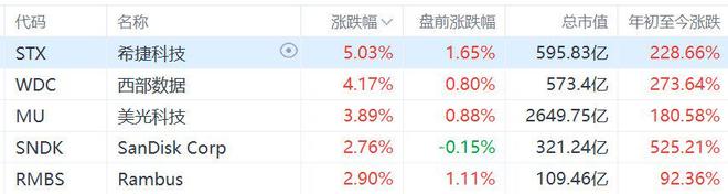 Core Viewpoint - The storage chip sector in the US stock market has seen a collective surge, with significant gains in major companies such as Seagate Technology, Western Digital, and Micron Technology [1]. Group 1: Company Performance - Seagate Technology (STX) experienced a rise of 5.03%, with a market capitalization of $59.583 billion and a year-to-date increase of 228.66% [2]. - Western Digital (WDC) increased by 4.17%, holding a market cap of $57.34 billion and a year-to-date growth of 273.64% [2]. - Micron Technology (MU) saw a gain of 3.89%, with a total market value of $264.975 billion and a year-to-date rise of 180.58% [2]. - SanDisk Corp (SNDK) rose by 2.76%, with a market capitalization of $32.124 billion and an impressive year-to-date increase of 525.21% [2]. - Rambus (RMBS) increased by 2.90%, with a market cap of $10.946 billion and a year-to-date growth of 92.36% [2].