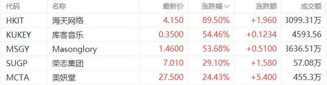 Core Insights - Chinese concept stocks experienced significant gains, with notable increases in share prices for several companies [1] Group 1: Stock Performance - Haitan Network (HKIT) saw a remarkable increase of 89.5%, closing at 4.150, with a trading volume of 30.9931 million [1] - Kuke Music (KUKEY) rose by 54.46%, reaching a price of 0.3500, with a trading volume of 4.59356 million [1] - Masonglory (MSGY) increased by 53.68%, closing at 1.4600, with a trading volume of 36.3651 million [1] - Rongzhi Group (SUGP) experienced a gain of 29.1%, closing at 7.010, with a trading volume of 570,800 [1] - Meiyantang (MCTA) rose by 24.43%, closing at 27.500, with a trading volume of 4.553 million [1]