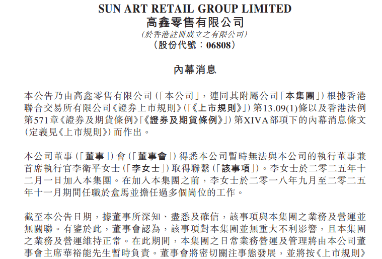 知名超市大润发突发,上任仅2个月的母公司CEO失联。 2月4日,大润发母公司高鑫零售突然在港交所发布公告称,公司暂时无法与执行董事兼首席执行官李卫平 取得联系。在公告中,高鑫零售有意强调公司董事确信该事项与集团之业务及营运并无关联。在李卫平失 联之后,高鑫零售的日常业务营运及管理将由董事会主席华裕能暂时负责。 零售老将李卫平 此前陷入失联疑云 值得注意的是,高鑫零售此番公告与昨日的公关口径大相径庭,2月3日,零售媒体联商网报道,大润发母 公司高鑫零售CEO李卫平被警方带走协助调查,该报道引用的知情人士表示,从上周五开始至今未看到李 卫平出现在公司,不过相关具体事项尚待进一步调查核实。随后,高鑫零售在回应媒体时表示"假的,在报 警了"。 但仅仅过了一晚,高鑫零售便一百八十度转折,将李卫平失联的消息公之于众,甚至在公告中还颇有切割 意味的强调与公司业务并无关联。 目前,此番李卫平失联具体原因尚不明确,这距离其从阿里系盒马转投高鑫零售仅过了2个月时间。 2025年11月30日,高鑫零售发布公告,沈辉因家庭事务原因辞任高鑫零售执行董事、首席执行官职务,李 卫平接替沈辉担任高鑫零售执行董事兼首席执行官。根据公告显示,李 ...