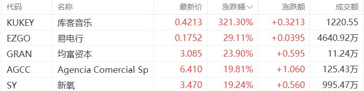 | 代码 | 名称 | 最新价 | 涨跌幅√ | 涨跌额 | 成交额 | | --- | --- | --- | --- | --- | --- | | KUKEY | 库客音乐 | 0.4213 | 321.30% | +0.3213 | 1220.55 | | EZGO | 易电行 | 0.1752 | 29.11% | +0.0395 | 4640.92万 | | GRAN | 均富资本 | 3.085 | 23.90% | +0.595 | 11.24万 | | AGCC | Agencia Comercial Sp | 6.410 | 19.81% | +1.060 | 125.43万 | | SY | 新氧 | 3.470 | 19.24% | +0.560 | 995.47万 | 中概股收盘涨幅前五的个股为:库客音乐涨321.3%,易电行涨29.11%,均富资本涨23.9%,Agencia Comercial Sp涨19.81%,新氧涨19.23%。(格隆汇) ...