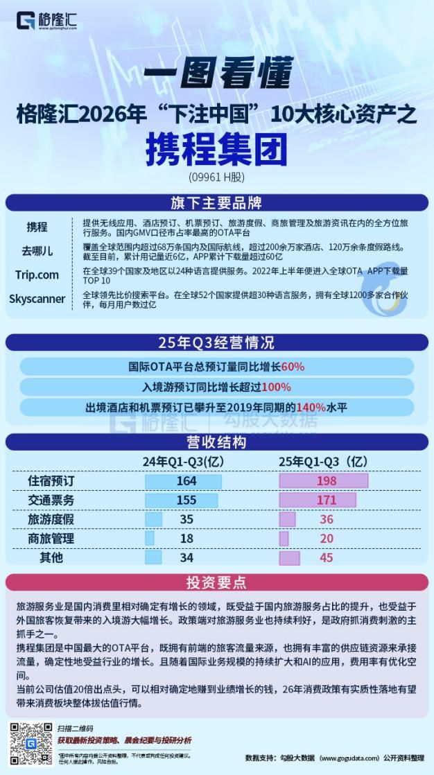 2026年度格隆汇"下注中国"十大核心资产已正式发布,携程集团(TCOM.US/9961.HK)历经多轮筛选 与角逐,最终入选成为核心资产中消费旅游领域的标杆标的。 以下是关于携程的入选逻辑与深度解析: 2025年国内消费市场虽仍存压力,但旅游细分赛道率先展现明确复苏迹象,叠加十五五规划"居民消费 率显著提升"的政策红利,服务消费成为消费升级的核心方向。作为中国在线旅游(OTA)行业的领军 企业,携程正告别"单一预订平台"的标签,加速推进从"国内OTA龙头"到"全域旅游生态服务商"的结构 性转型。 凭借"国内基本盘稳固+国际业务突围+供应链全覆盖+技术赋能"的独特模式,携程已构建起兼具"抗周 期韧性+成长确定性"的盈利结构。2025年前三季度公司营收470亿元,同比增长16%,调整后营业利润 132.9亿元,同比增长11.5%,在消费大环境承压下展现出极强的稳健性,成为2026年"消费复苏+政策红 利"行情中最具配置价值的核心标的。 | 南旅管理 | 18 | 20 | | --- | --- | --- | | 其他 | 34 | 45 | | 投资要点 | | | | 旅游服务业是国内消费里相对确定有增长 ...